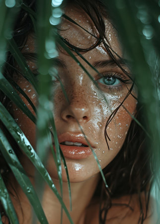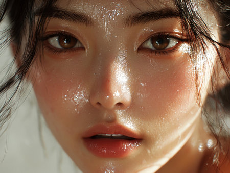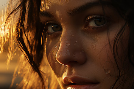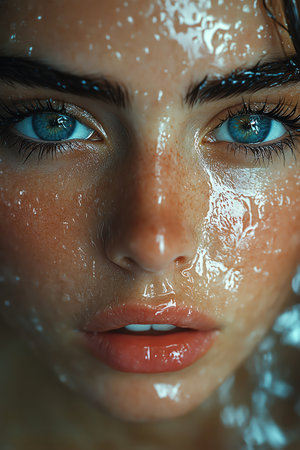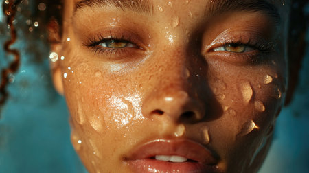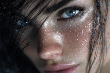 A woman gazes intensely with glistening skin and droplets of water accentuating her features.
