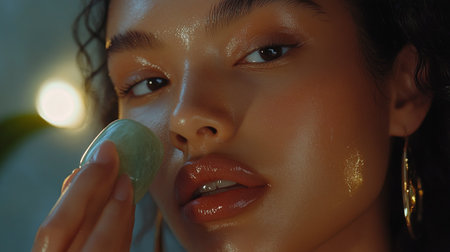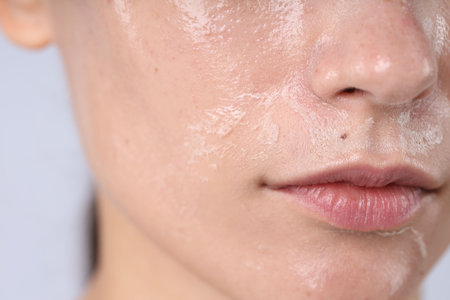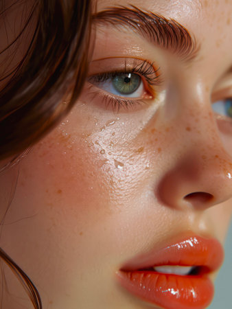 Close-up of wet glossy lips and fresh hydrated skin after skincare treatment. Concept of beauty, moisture, and healthy glow for cosmetics, skincare, and wellness advertising.