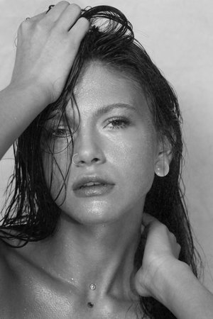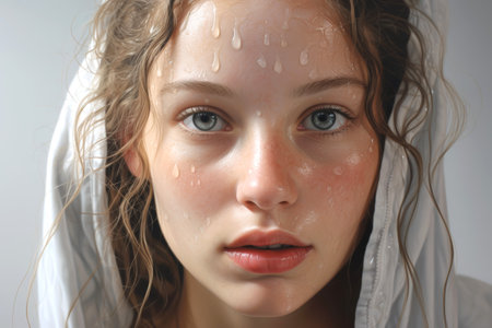 A striking woman gazes intensely, with her wet hair framing her face beautifully and effortlessly.