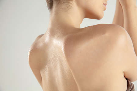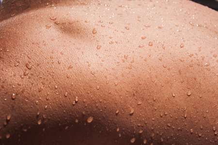 A person's back is wet with water. The water droplets are spread out and covering the entire surface of the back