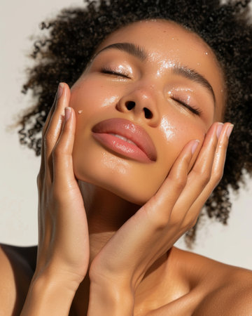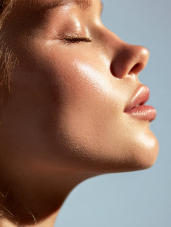 A radiant woman's complexion shines softly under gentle sunlight, highlighting luminous, dewy skin that exudes tranquility and natural beauty.