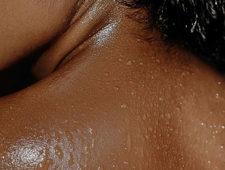 Water drops are visible on a woman's body without retouching with her natural imperfections