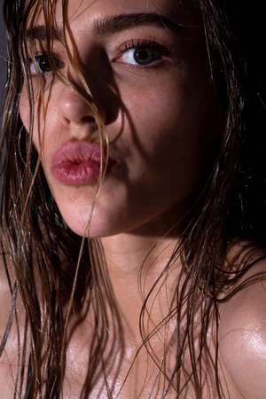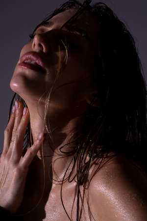 portrait of a woman bare shoulders clean skin wet hair dark background