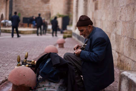 Adana, Turkey 12/26/2009: Close up portrait of an elderly shoe polisher who is working with a vintage shoeshine toolbox in the street. He sits on a stool by his work bench in the historic district.