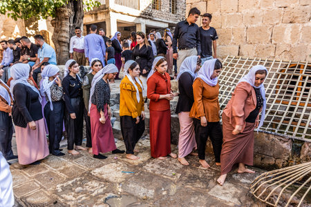 LALISH, IRAQ - SEPTEMBER 30, 2022: Yezidi women during Friday festivities in Lalish temple complex, Kurdistan Region of Iraq