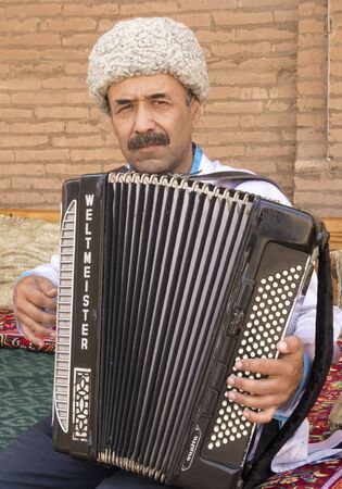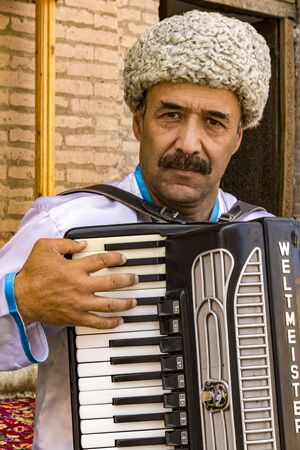 Khiva, Uzbekistan - May 23, 2017 - Man plays traditional Uzbekistan music on accordion