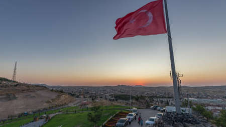 Sunset view from old castlethe in historical city town of Nevsehir aerial timelapse. Panoramic skyline with flag at evening