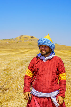 Lavi, Israel - July 01, 2022: Reenactment of the 1187 Battle of the Horns of Hattin (Ayyubid sultan Saladin defeated the crusaders): Participants dressed as knights. Horns of Hattin, Israel