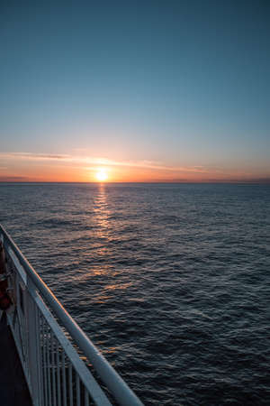 Deck of ferry sailing across the sea during last moments of a beautiful sunset with arriving land in the background. Concept of relaxation, adventure, freedom, luxury and leisure