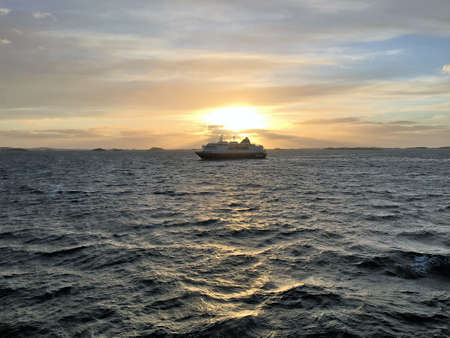 The ship MS Richard With from the Norwegian Coastal Express/Hurtigruten in sunset outside the village Bud in western Norway.