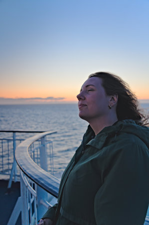 Beautiful woman relaxing against the boat balcony railing with her eyes closed and the wind in her hair. Glowing sunset on the sea Scandinavian coast summer vacation