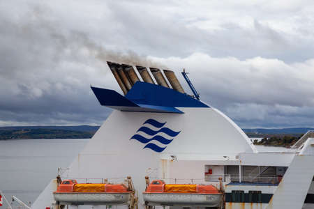 Ferry MS Crown Seaways. Exhaust funnel smokestack with logo letters DFDS, Danish Freight Transportation, Passenger and Car Transportation company Oslo Fjord Norway 08-01-2023