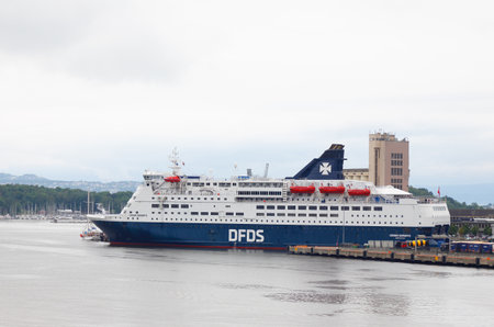 Oslo, Norway. Modern Ferry Boat At Pier Awaiting Loading Cargo From Port And Passenger Boarding And From Terminal. DFDS is a Danish international shipping and logistics company