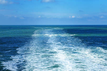 Wake of a ship on the ocean, white foam in a blue sea under clear sky