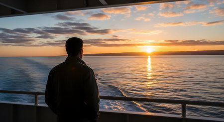 A man stands on the deck of the ferry and watches the sunset at Atlantic ocean. Polar sun