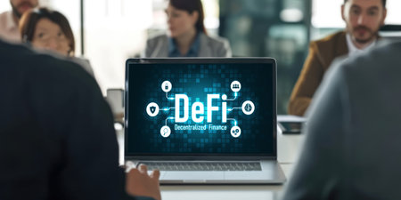 Decentralized finance or DeFi concept on brisk computer screen . The defi system give new choice of investment and money saving .