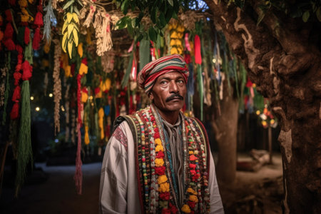 shot of a man wearing traditional attire while standing in front of decorated trees, created with generative ai