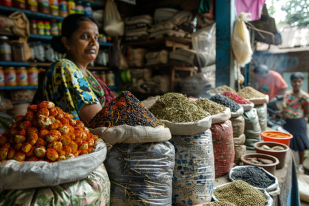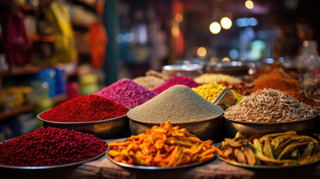 Bustling Indian Spice Market with Vibrant Displays of Colorful Spices Fragrant Teas and Fresh Naan Bread