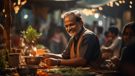 An elderly man skillfully prepares spices and traditional food amidst a colorful market scene, reflecting rich culinary heritage and vibrant culture.