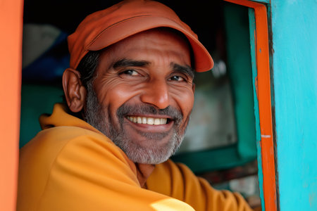 Cheerful Indian worker smiling brightly while looking out from his vibrant booth, surrounded by colorful decor and daylight