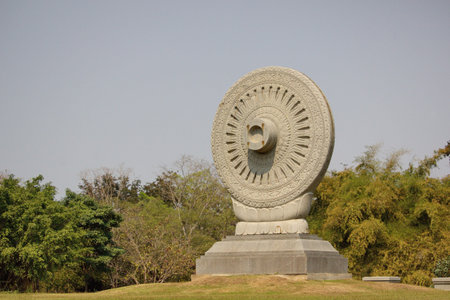 india’s ashoka wheel etched in stone amid scenic greenery at Sarnath near Varanasi, India.