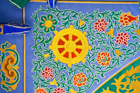 Traditional details of decor of dugans, Buddhist temples. Ivolginsky datsan, Buryatia, Russia