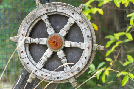 Old Wooden Ship's Wheel. A weathered wooden steering wheel with a rusty center hangs decoratively amidst the greenery. The wheel is reminiscent of times gone by on the high seas.