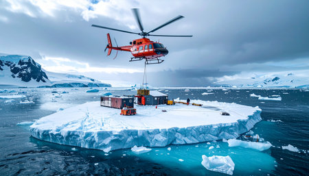 A helicopter performs a critical supply drop to a remote scientific outpost adrift on an iceberg.