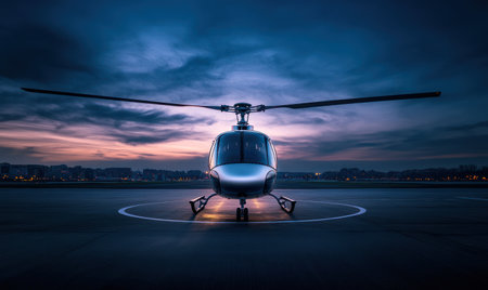 A helicopter is positioned on a rooftop overlooking a distant cityscape. The image features warm sunset colors with a silhouette of the helicopter. This composition creates a dramatic feel with natural lighting. Suitable for travel, transportation, or business concepts.