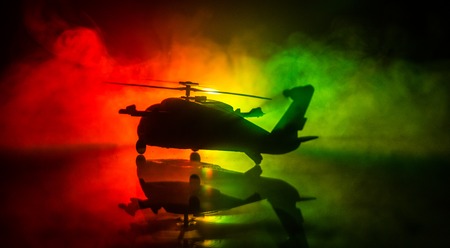 Silhouette of military helicopter ready to fly from conflict zone. Decorated night footage with helicopter starting in desert with foggy toned backlit. Selective focus. War concept