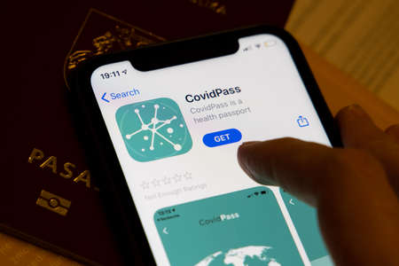Vaccination, disease immunity passport, health and surveillance concepts. Smartphone displaying a valid digital vaccination certificate for COVID-19.