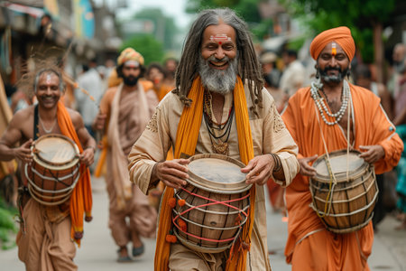 Colorful Traditional Procession of Joyful Musicians Playing Drums in a Bustling Village Street