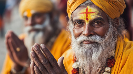 Two devout Hindu holy men wearing vibrant orange robes share a moment of prayer. Their serene expressions and traditional attire reflect spirituality and cultural heritage.
