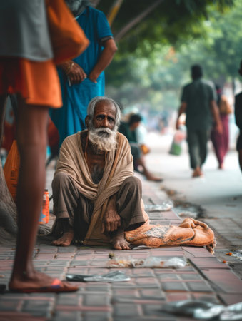 An elderly man with a white beard sitting alone on a busy street, with blurred figures walking by
