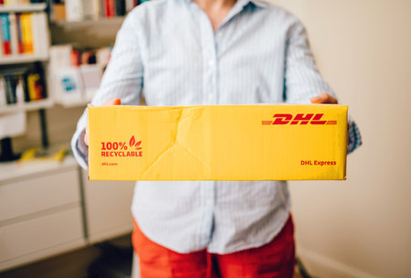 Strasbourg, France - Sep 15, 2018: POV male hand holding reading the text on the label of a DHL parcel business envelope with SXB destination code