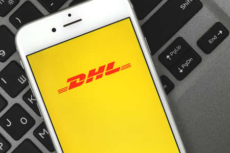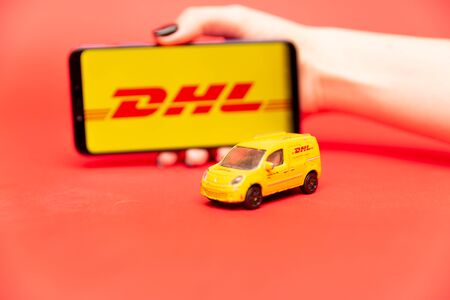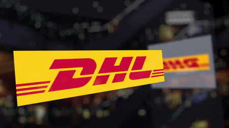 KONSKIE, POLAND - MAY 02, 2018: logo of the brand. DHL on paper sheet
