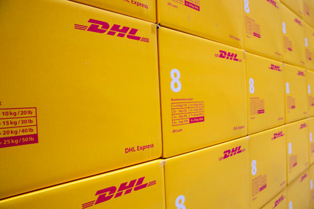 Sofia, Bulgaria - 17 October, 2018: Yellow DHL Express packages are seen arranged in a warehouse.