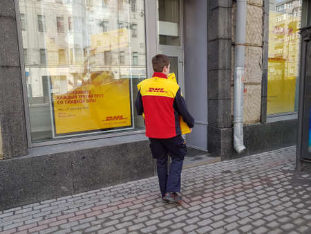 Moscow, Russia - March 11, 2020: DHL Deutsche Post courier in yellow-red uniform near minivan with company logos. DHL International GmbH is world largest courier, parcel, and express mail service
