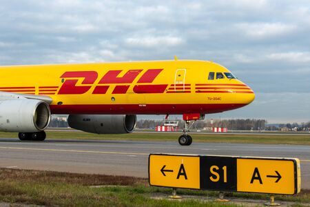 Warsaw, Poland. 15 April 2018. Sign DHL. Company signboard DHL.
