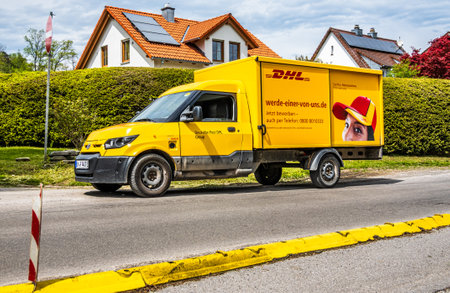 Tutzing, Germany - May 11: typical german dhl truck at the old town of Tutzing on May 11, 2021