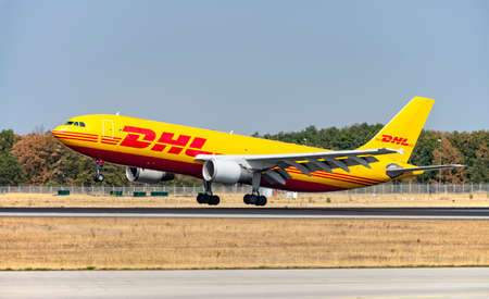 DHL aircraft (Airbus A300-600 - D-AEAK) on the northwest runway of Frankfurt Airport. Frankfurt, Hesse / Germany - 29.08.2019