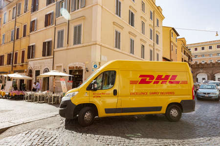 DHL delivery van in Rome streets , Italy, summer sunny morning