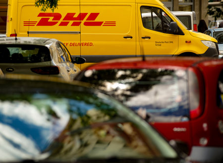 DUSSELDORF, GERMANY - CIRCA SEPTEMBER, 2018: close up shot of a DHL sign on a van in Dusseldorf.
