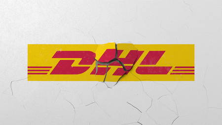 Breaking wall with painted logo of DHL. Crisis conceptual editorial 3D rendering