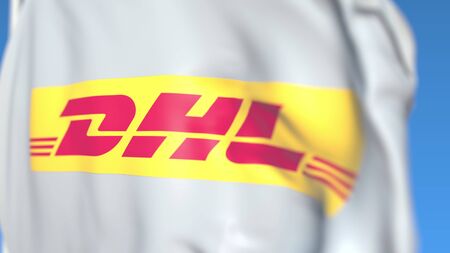 Waving flag with DHL International GmbH logo, close-up. Editorial 3D rendering
