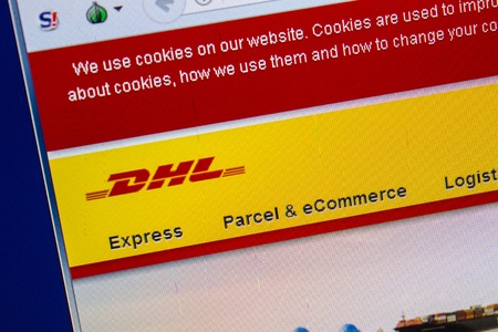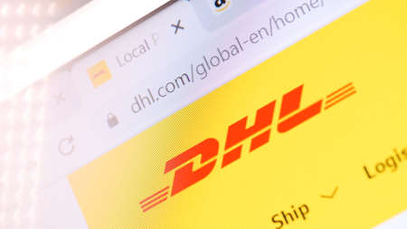 DHL domain name in browser and logo on the computer screen. Editorial macro shot