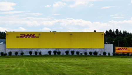 Przeclaw, Poland - February 28, 2020: DHL Parcel Customer Service Point with stormy sky in background. The company operates in over 220 countries and territories worldwide.