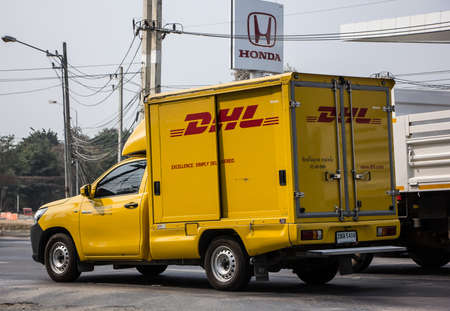 Chiangmai, Thailand - January 29 2021: DHL Express and Logistics Container Pickup truck. Modify from Toyota Hilux Revo. Photo at road no 121 about 8 km from downtown Chiangmai, thailand.