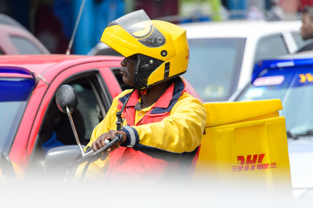Moscow, Russia - March 13, 2017: Courier of a logistics company DHL carries boxes