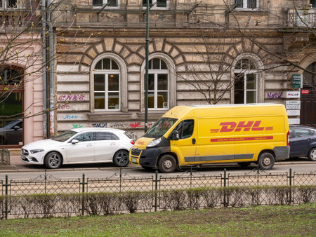 DHL package delivery service truck, van, vehicle parked on the street near a building, DHL German logistics courier company, urban area, Krakow, Poland